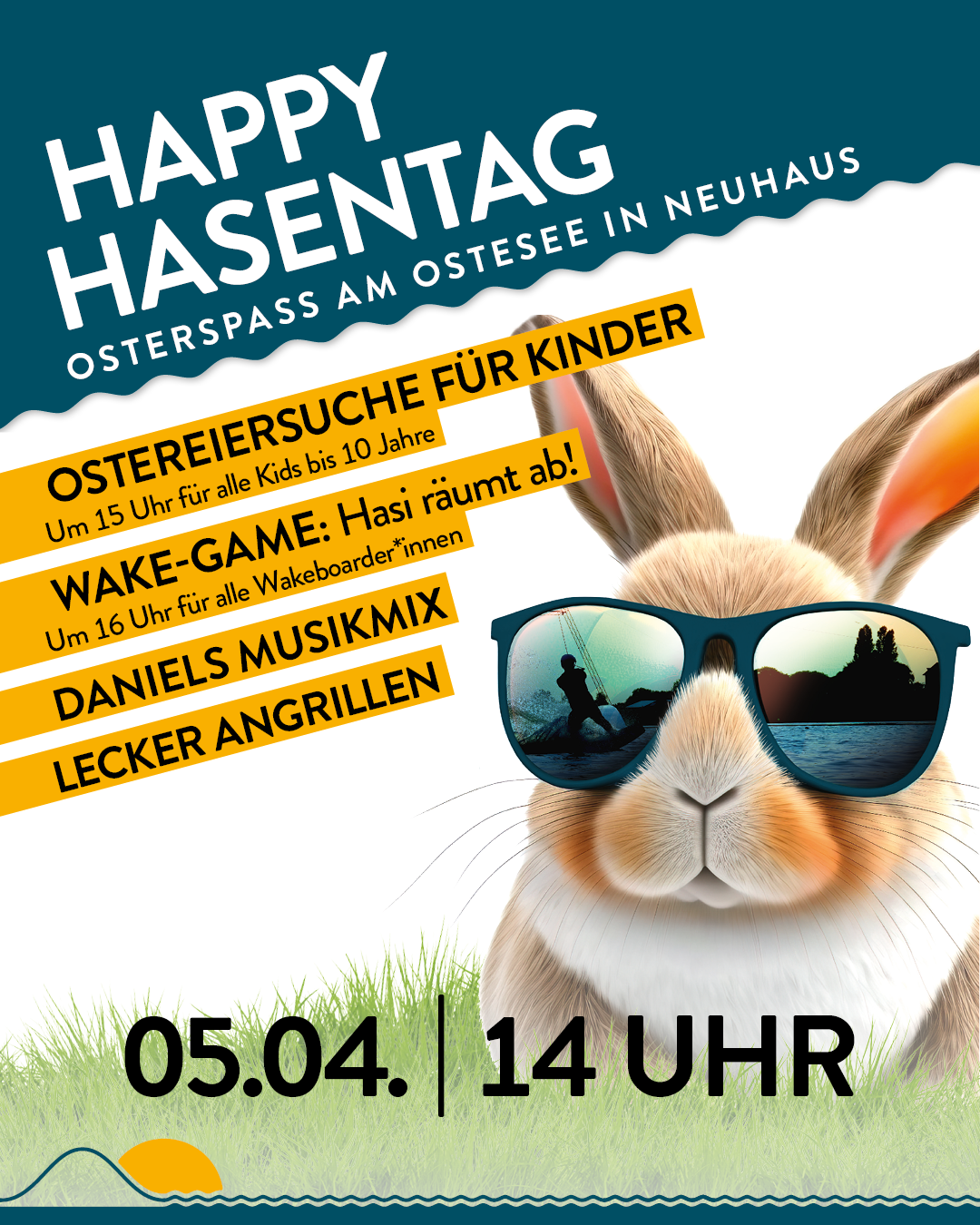 Happy Hasentag! - 05.04.2026 ab 14 UhrWir haben das perfekte Ausflugsziel für deinen Ostersonntag! Am 05. April feiern wir von 14-19 Uhr unseren Happy Hasentag. Unsere Highlights des Tages: Um 15:00 Uhr – Ostereiersuche für Kinder bis 10 Jahre. Um 16:00 Uhr – Wake-Game: „Hasi räumt ab“ Bei beiden Aktionen warten tolle Gewinne & jede Menge Überraschungen auf euch – seid gespannt! Außerdem: Leckeres Angrillen und für den richtigen Sound sorgt Daniels Musikmix. Also komm vorbei, bring Freunde & Familie mit und feiere mit uns einen nvergesslichen Happy Hasentag! Wir freuen uns auf euch!