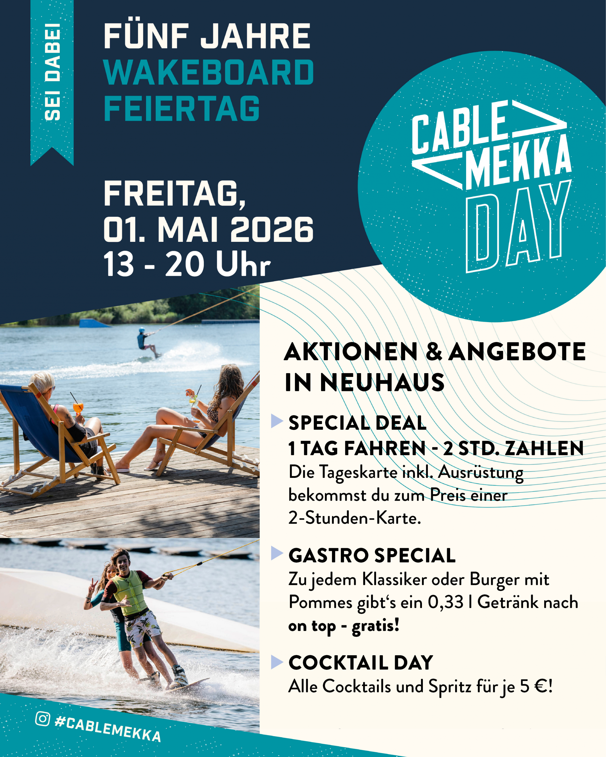 Cable Mekka Day 2026 - 01.05.2026 - 13 bis 20 UhrEs ist wieder Cable Mekka Day! Am 01.Mai von 13-20 Uhr feiern wir mit dir den Tag der Wakeboard-Community. Zu diesem besonderen Anlass haben wir natürlich wieder tolle Aktionen & Angebote für dich: - SPECIAL DEAL 1 TAG FAHREN - 2 STD. ZAHLEN: Die Tageskarte inkl. Ausrüstung bekommst du zum Preis einer 2-Stunden-Karte. - GASTRO SPECIAL: Zu jedem Klassiker oder Burger mit Pommes gibt es ein 0,33 l Getränk nach Wahl on top - gratis! - COCKTAIL DAY: Alle Cocktails und Spritz für je 5 €. Klingt das nicht gut? Komm vorbei und feiere mit uns!?
